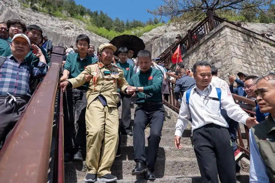 老兵因年龄、身体状况原因,无法登上爬99级台阶,观看龙门石窟标志性的佛像,有一位老兵很想上去。